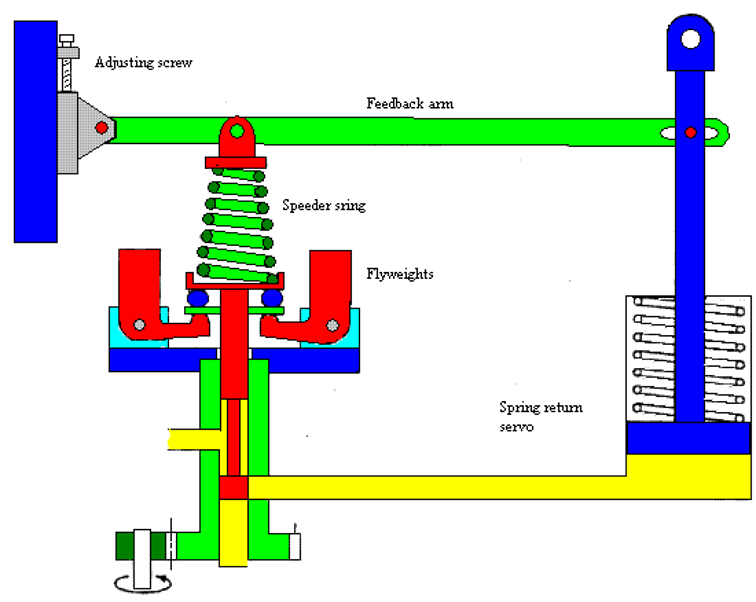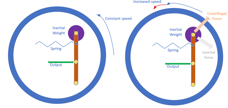 A governor arrangement rotates with the engine. With increasing speed there are two components that contribute to movement of the lever against the spring and control output. These are increasing centrifugal force and a force due to inertia.