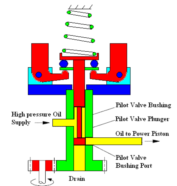 Should the engine speed fall the flyweights will tend to fall towards the axis rotation due to pressure from the speeder spring overcoming the reduced centrifugal force. The pilot valve moves down and the control land allows oil to flow to the servo piston raising it. When the engine speed increases the flyweights begin to overcome the speeder spring and the pilot valve moves up covering the servo supply port