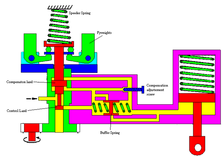 Should the engine speed fall the flyweights will tend to fall towards the axis rotation due to pressure from the speeder spring overcoming the reduced centrifugal force. The pilot valve moves down and the control land allows oil to flow to the servo piston raising it. This increases the fuel supply to the engine but also reduces the speed set point as the feed back lever is also raised moving the connection to the speed spring upwards reducing spring pressure. The Flyweights are able to raise the pilot valve closing off the supply of oil to the servo