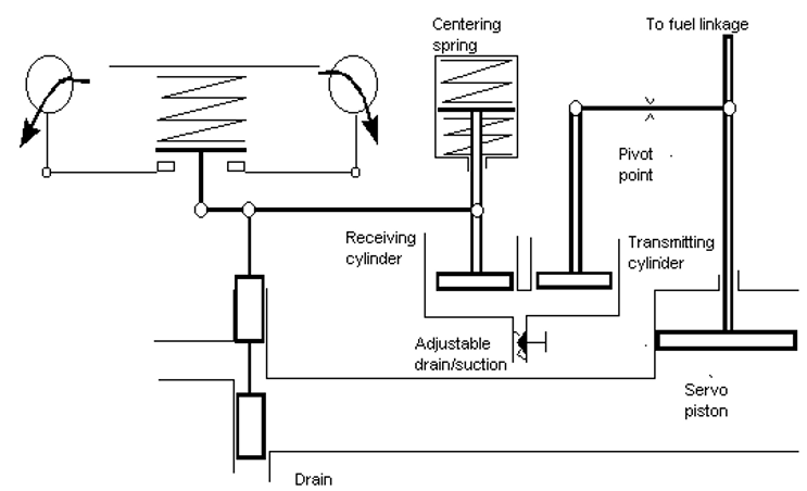 Compensation takes place to provide a further slight fuel change to return the speed to normal. The centering spring forces the receiving piston downwards and oil escapes through the adjustable valve.. This lowers that end of the floating lever until both centering springs are equally loaded and that end of the floating lever is in its original position. The pilot valve is open slightly allowing oil to the servo which gives a further slight increase in fuel. The engine speeds up, the rotating weights move out and the pilot valve is lifted until it is closed. The engine now operates with increased load, increased fuel but at the same original speed.