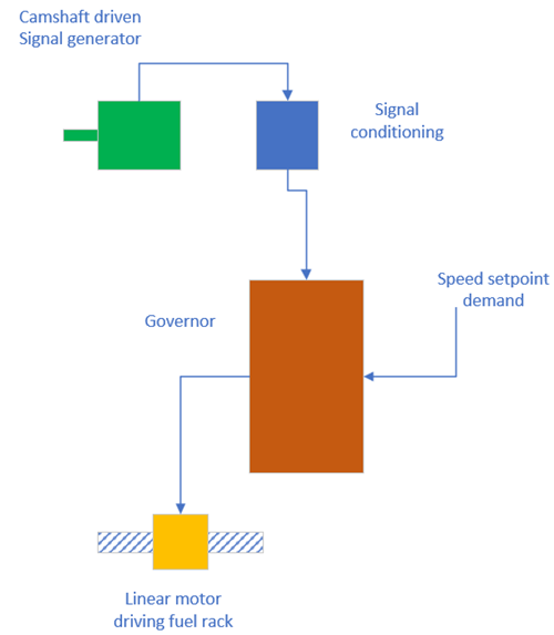For this system the engine speed is measured using an alternator driven off the camshaft- this is a common arrangement. The speed set signal is typically supplied by the bridge control arrangement via the engine management system.